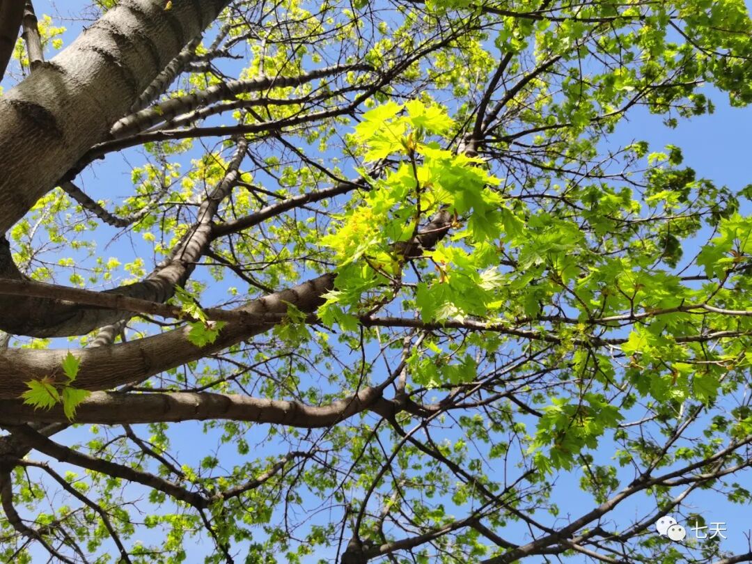 难以置信,春天里既可以看到枫叶初发时的嫩黄,还可以欣赏到逃脱了秋天的风,冬天的雪,仍然挂在枝头的饱经风霜的酒红色的枫叶