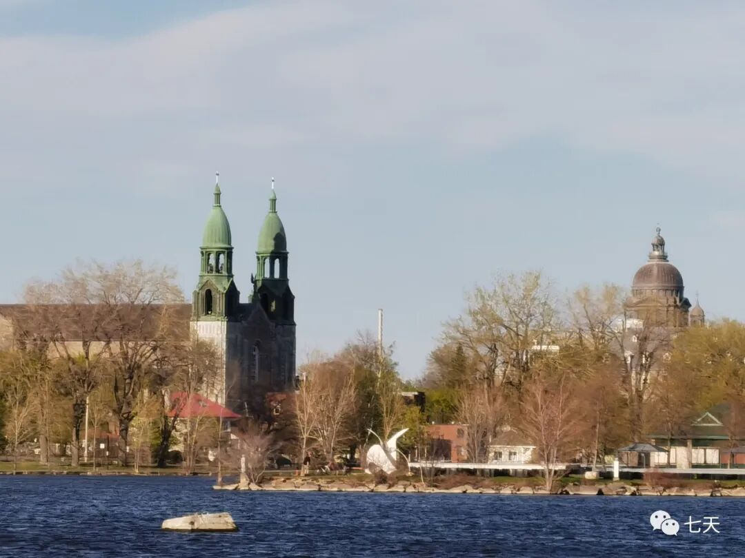 隔着圣劳伦斯河,看到了中国小镇(Lachine)上的教堂