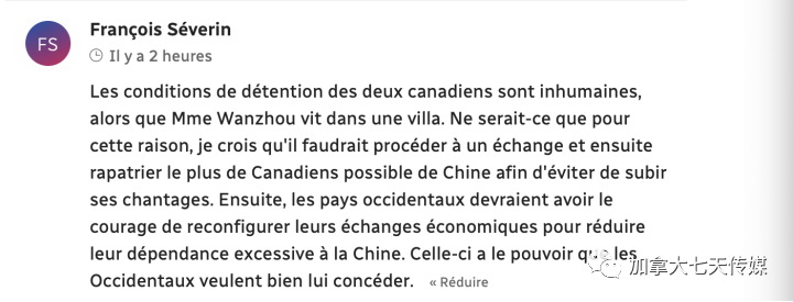 两名加拿大人的拘留条件很不人道,而孟晚舟女士则住在一栋别墅中。仅出于这个原因,我认为我们应该进行交流,然后从中国遣返尽可能多的加拿大人,以避免被勒索。西方国家应该有勇气重构经济,以减少对中国的过度依赖。这是西方人愿意考虑的。