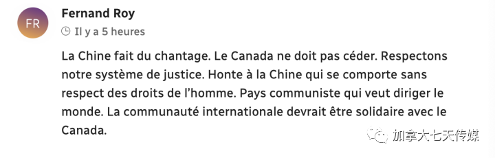 中国这是敲诈啊,加拿大绝不能屈服,我们得尊重自己的司法制度。对中国的不尊重人权行为感到羞耻。共产主义国家想要统治世界。国际社会应声援加拿大。